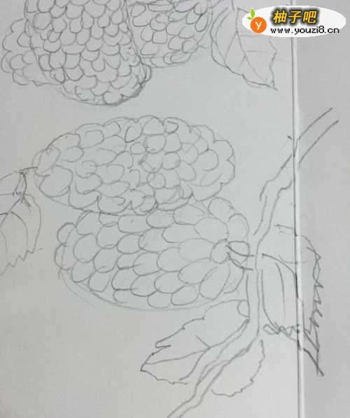 4第四步 以同样的方法 再画上第三个桑葚 还有它的叶子
