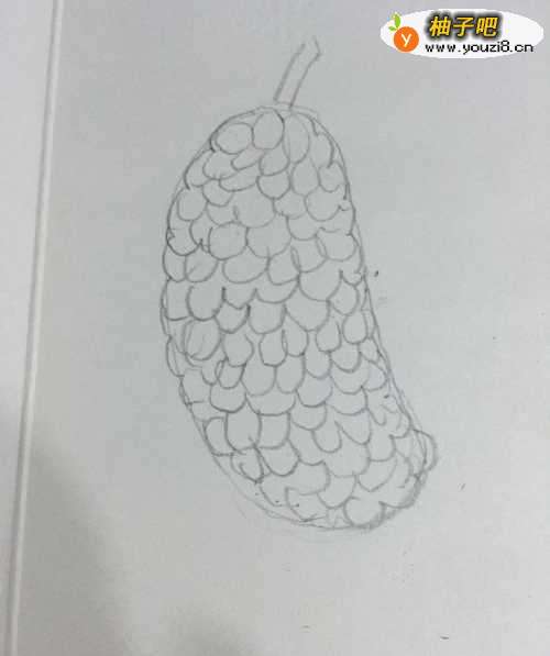 2第二步 在这个椭圆形上画上大小不一 排列密集的小圆圈 然后再画上一个桑葚梗