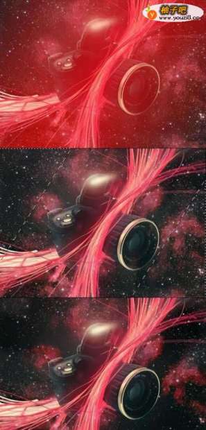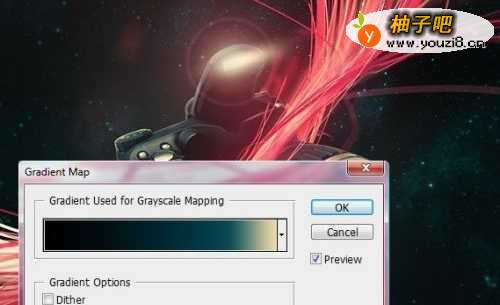 18定位和修改。为了局限它的主色调,我创建了一个渐变映射,就好像你变换相机镜头的光圈来调整照片的色调一样:添加调整图层,使用类似的配色,并为镜头光晕做一个剪贴蒙版。此外,设置火炬的混合模式为滤色,不透明度80%。