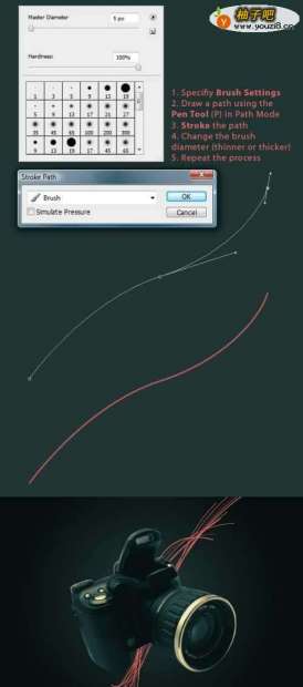 4现在我们要开始比较繁琐的部分。先在相机图层下方创建一个新图层以适应它们。用钢笔(P)画出线条,但是在画之前我们需要好好设置下钢笔(B)。选择一个适当的宽度和颜色(e66663)。进入路径模式,用钢笔(P)画出所需路径,右键选择描边路径,这里你要确保”模拟压力”没有打上勾。然后转换(Command+T)路径,略微改变倾斜度。然后选用不同宽度的钢笔再重复以上步骤。