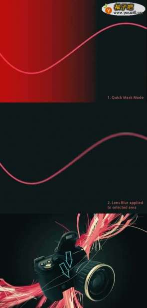 22进入快速蒙版模式(Q),从图片中心拖动一个反射的线性渐变(黑色和白色),然后退出(Q)。在这里你应该选取相机如下图所示,然后去滤镜>模糊>镜头模糊,添加模糊效果,并且按照实际情况来调整参数。