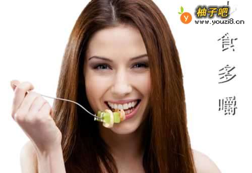 4少食多嚼:在感到有点儿饿时开始吃饭,而且每餐在固定时间吃;每次少盛一点,或使用浅盘和透明餐具;吃饭至少保证20分钟,因为从吃饭开始,经过20分钟后,大脑才会接收到吃饱的信号。一般来说,每口食物咀嚼15—20次,有助消化,避免发胖,还能缓解紧张、焦虑的情绪。不妨用小汤匙代替筷子,或者轮流使用勺子和筷子吃饭,即使想快也快不起来,保证每口食物都能充分咀嚼。