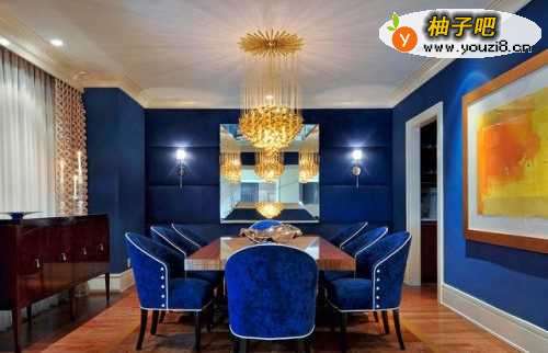 蓝色,是一种令人产生遐想的色彩。传统的蓝色常常成为现代装饰设计中热带风情的体现。蓝色还具有调节神经、镇静安神的作用。蓝色清新淡雅,与各种水果相配也很养眼,但不宜用在餐厅或是厨房,蓝色的餐桌或餐垫上的食物,总是不如暖色环境看着有食欲;同时不要在餐厅内装白炽灯或蓝色的情调灯,科学实验证明,蓝色灯光会让食物看起来不诱人。但作为卫浴间的装饰却能强化神秘感与隐私感。