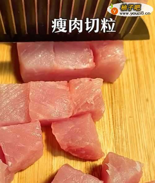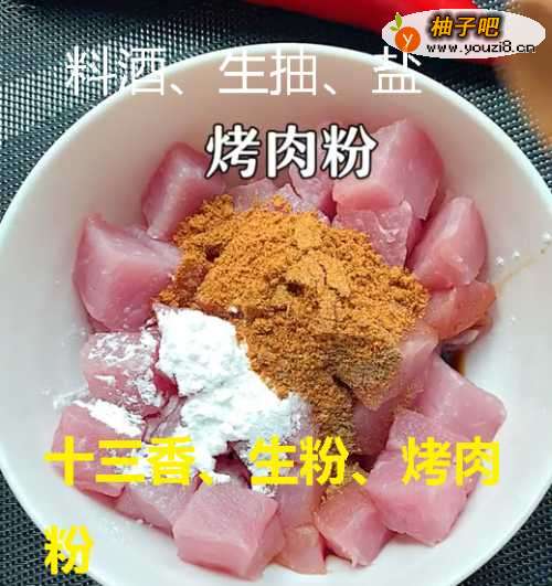 2●第二步:准备小碗,加入切粒的瘦肉、少量的料酒、生抽、盐、烤肉粉、十三香和生粉。