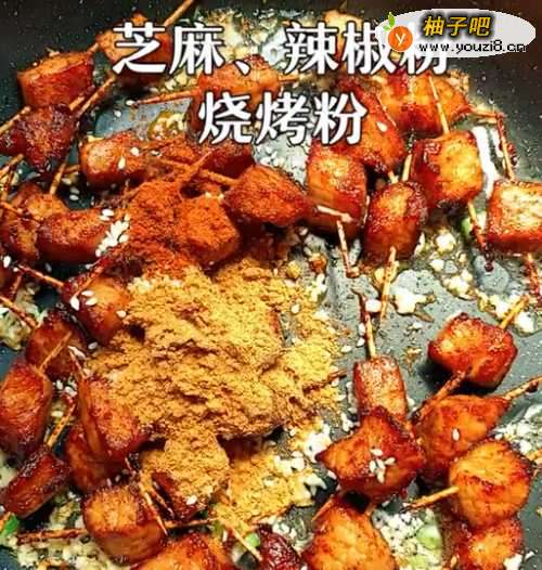 6●第六步:继续往锅中加入少量芝麻、辣椒粉和烧烤粉,炒至瘦肉串和酱料均匀沾上即可。