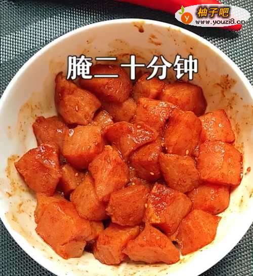 3●第三步:将瘦肉和调料抓匀腌制二十分钟,并串上牙签。