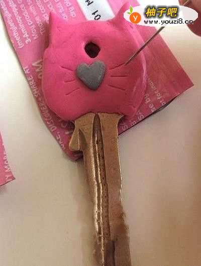 3用针将捏好的粘土从钥匙原本自带的口子处,掏一个小洞,方便钥匙圈套入,便于携带。掏好洞之后,再加入一点粘土,在钥匙洞的上方捏出两个猫耳形状。
