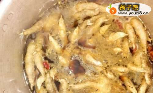 5第五步把鸡脚炸到表皮气泡为止。尽量放多点油会比较好炸些。个人经验提示。