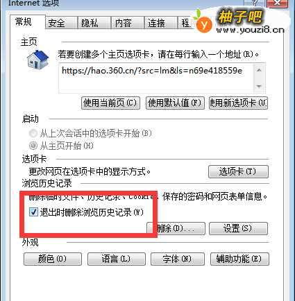 3在Internet选项设置界面,常规选项中,勾选退出时删除浏览记录,如图