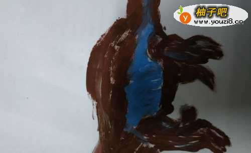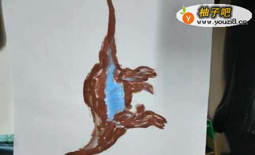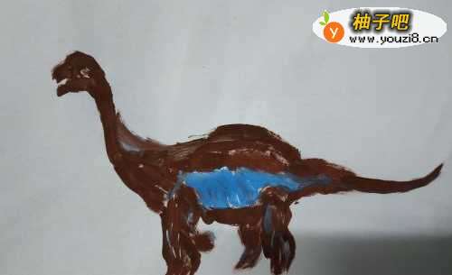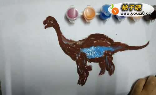6用褐色画腕龙的长尾巴,用蓝色画腕龙的大肚子和皮肤凹处。瞧,一只美丽可爱的腕龙就绘画成了。