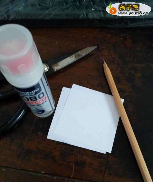 我们先准备好工具,两张白色的正方形纸,一只笔,一瓶胶水,一把剪刀备用。首先把两张纸取出来备用。