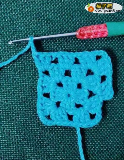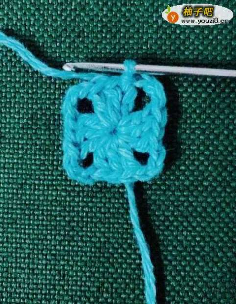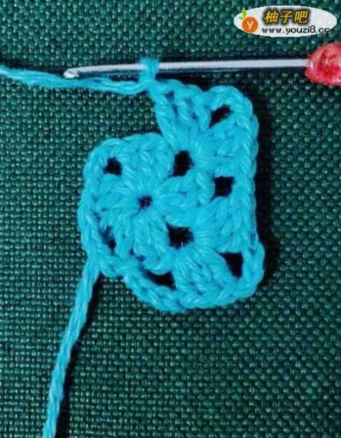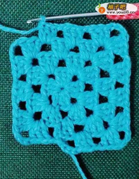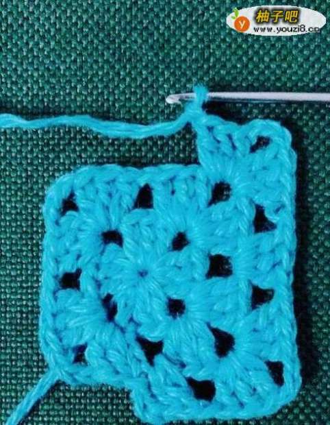 5拉花3针,钩中长针2针,拉花1针。在正方形的顶角花孔里面钩中长针3针,拉花3针,钩中长针3针。