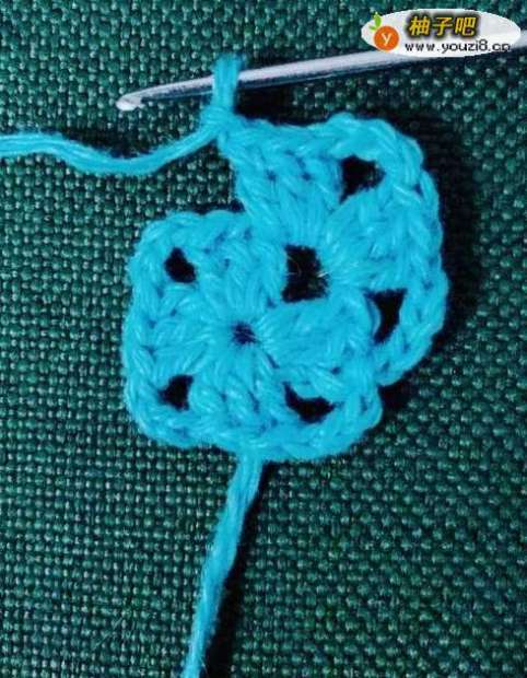4拉花1针,正方形的下一个顶角花孔里面钩中长针3针,拉花3针,钩中长针3针。按此步骤方法编织完成1圈。