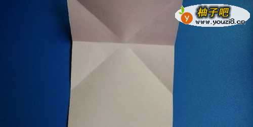 2将长方形彩纸的上方,拿着一角沿对角线对折二次后,然后沿着中间线对折一下,如下图所示。