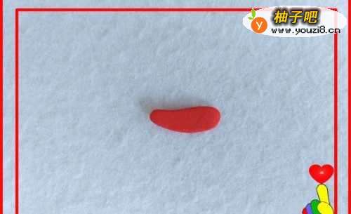 8再取红色彩泥适量,压成椭圆片,制作出小手的形状。