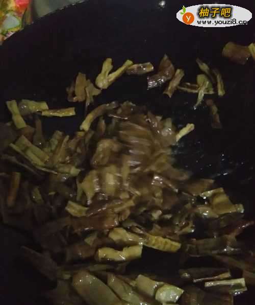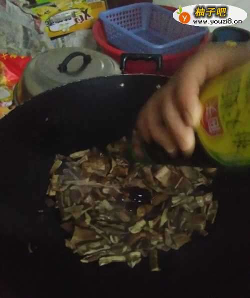 首先将已经出过味(开水煮过并浸泡过的)火笋切成块,稍微长一点,放入烧红的锅里,并放入适量的盐,翻炒几下盖上锅盖沥干火笋的水份;