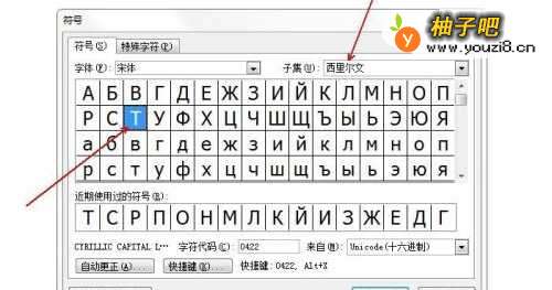 4在“子集”中选择“西里尔文”,并在下方选中西里尔字母Т,点击“插入”。