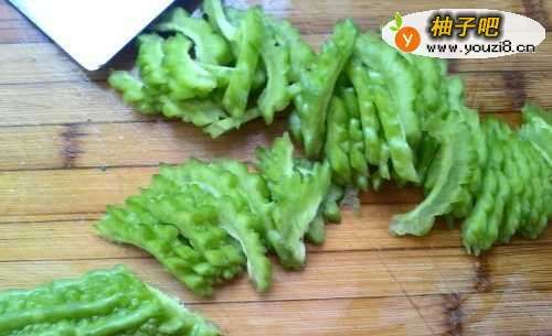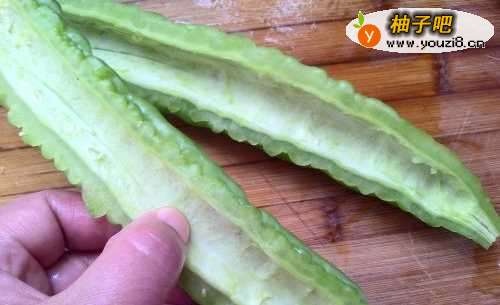 2将苦瓜洗净,劈开,将瓜瓤挖掉。