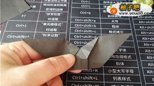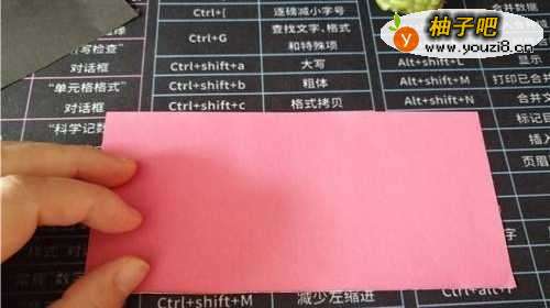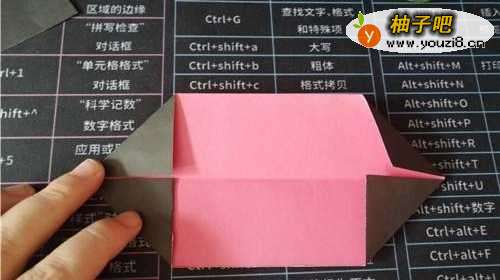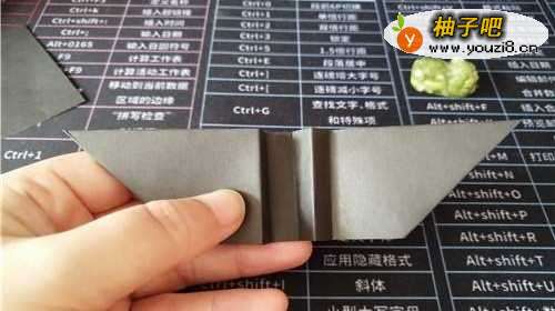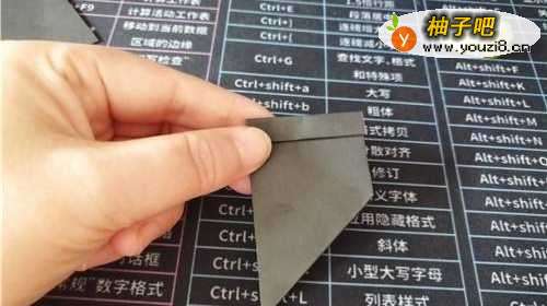 3我们把彩纸竖起来,把上面的边下折一点,沿着折痕向后折,如图所示。