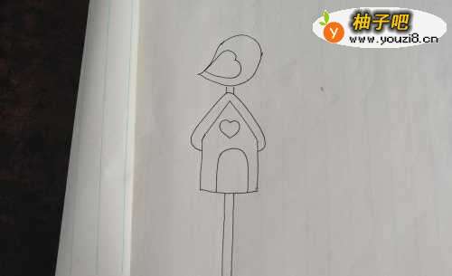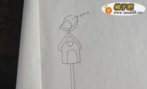 4接下来,再把房子的顶上画上站立的小鸟。