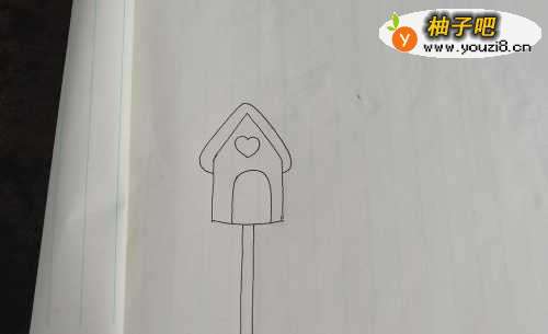 3我们给房子画上心形装饰,画上屋顶和门的形状。
