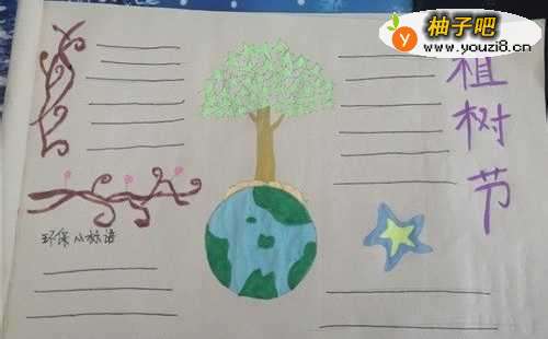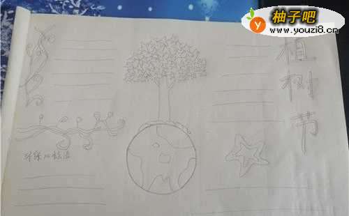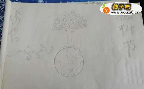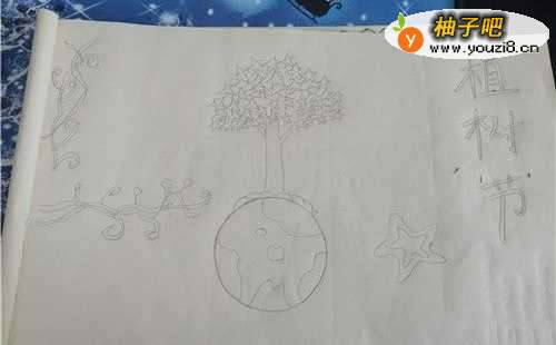 4画好后我们在修饰一下边角,然后再旁侧提上植树节标题。