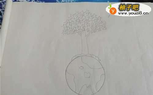 3画好后我们在刚刚画的土壤上面画上一颗树,树叶用星星来装饰,画好后我们在旁边画上树藤。