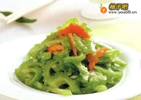 5再一下入苦瓜煸炒,调入盐、鸡粉、白糖炒至成熟,淋入香油,装盘即口。