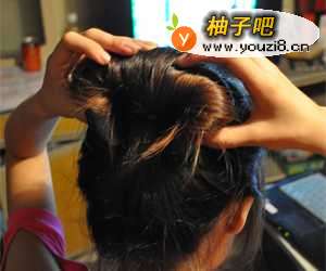 8在把盘发器弯曲成圆形后就会形成一个花苞,然后我们再用手整理一下头发,把盘发器掩盖掉住。