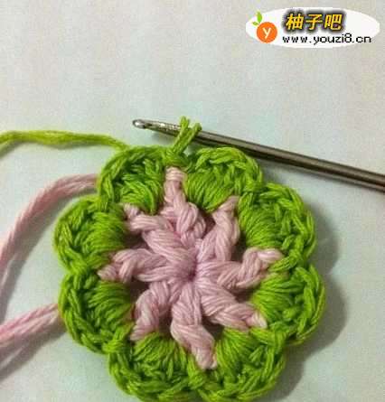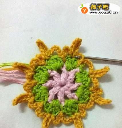 5然后换成黄色线继续编织,在上一步绿色花瓣的衔接处起头先拉花4针,然后紧锁到绿色花瓣的最顶部针孔里面,再拉花8针,依然紧锁到刚刚的绿色花瓣的最顶部针孔,依然拉花4针,紧锁到下一个绿色花瓣的衔接顶点处,按此步骤循环完成1圈,这样一朵漂亮花瓣的花样就编织完成。
