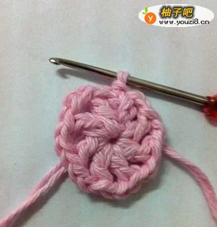3粗粉色线开始编织,首先用钩针打出1个活头结线圈,然后在这个活头结线圈里面先钩中长针1针,然后拉花1针,这样循环操作8次,然后紧锁到第一针中长针的针孔里面,钩出1个粉色小花。