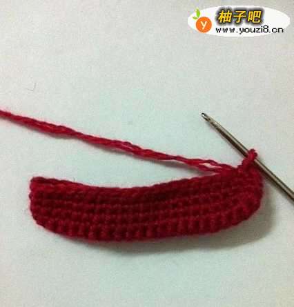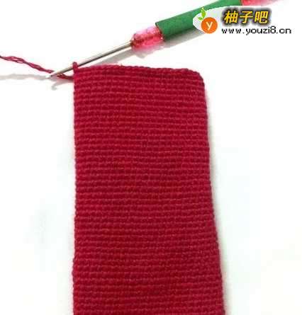 2继续沿着钩出的小条条锁针一圈又一圈,这样钩出,1个小船样,继续锁针,共计锁针56圈,这样就钩出1个红色的长方形小袋子,小手机包的基本轮廓就编织完成了,收针断线。