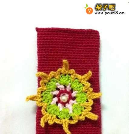 6将花样缝合在红色小包袋上,这样一款清新复古的手钩编织手机袋就这样编织完成了。