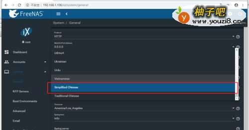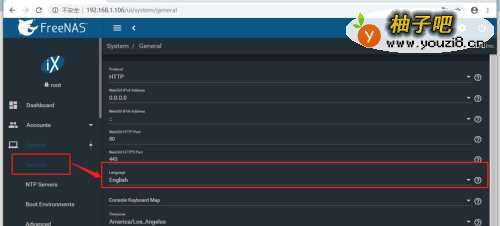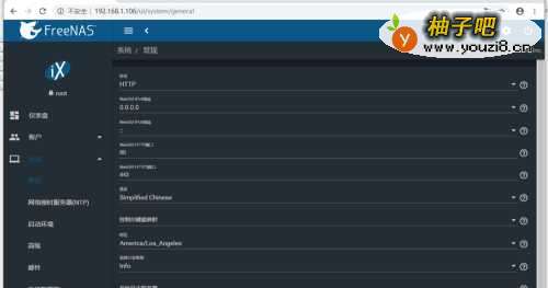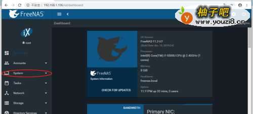 2进入FreeNAS界面以后,在界面的左侧选择System选项,点开下拉菜单。