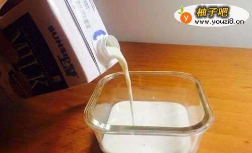 2选用一盒脱脂牛奶,适量倒入容器。量以压缩面膜完全吸收泡开为准,可以多但不能少,以免面膜纸不够湿润反而吸收肌肤的水分。