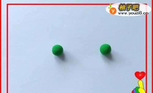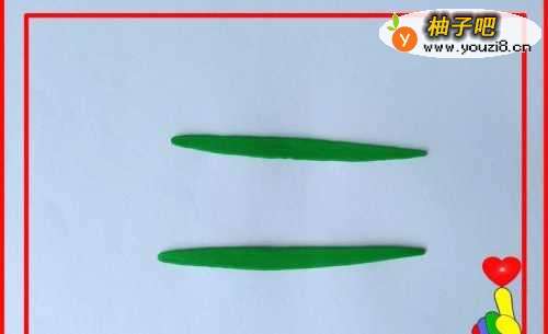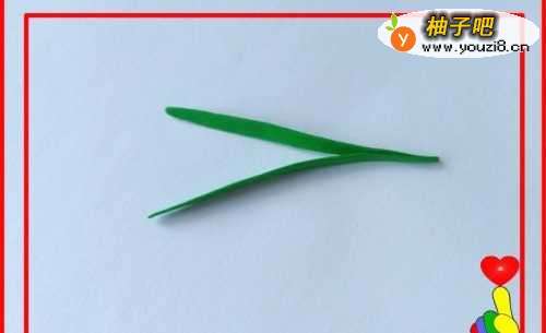 5再取绿色彩泥适量,制作两片略长的叶子,粘合在外层。
