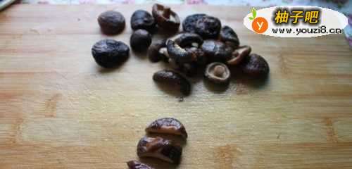 3把洗干净的香菇一切三。 红辣椒切碎,蒜瓣切片。