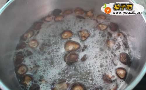2水开以后放香菇煮5分钟关火,用这个热水继续泡香菇15分钟,泡够时间以后用流动水洗干净香菇备用。