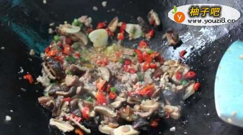 5肉沫变色以后放蒜片,红辣椒,香菇,炒3分钟左右加盐,酱油即可出锅。