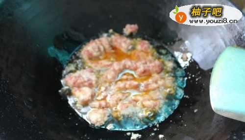 4锅里放油,冷油下肉沫,一定要用冷油,热油会使肉沫起疙瘩。肉沫下锅要迅速搅散,免得油热了起疙瘩。