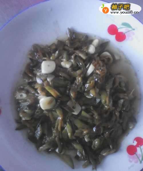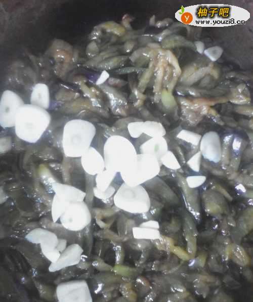 6茄子炒至七成熟时,放入切好的蒜瓣。