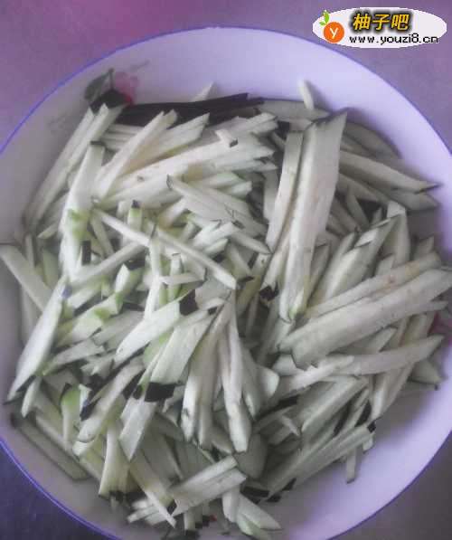 2把茄子切成丝盛盘。