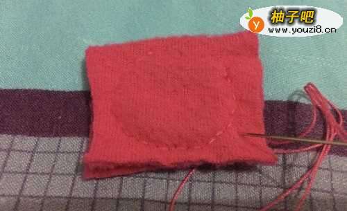 21.翻面地折玫红色面料,缝衣针穿线后缝制多半个圆,留一个缺口。