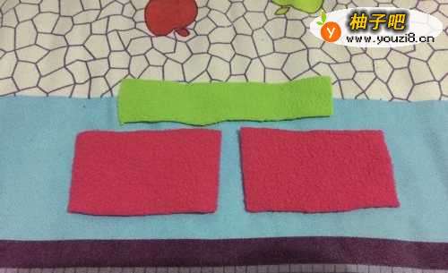 准备2块玫红色面料4*3公分,1块嫩绿色面料8*1.5公分。