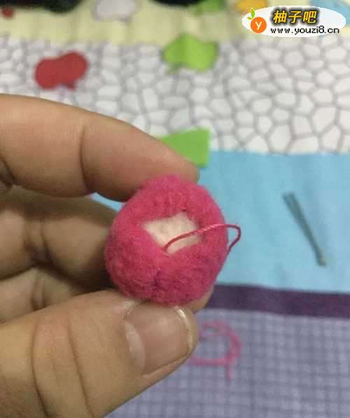 3将棉花扯出一缕用小镊子塞入球,直到塞满棉花后进行缝口。另一个小球也按如此方法进行制作。