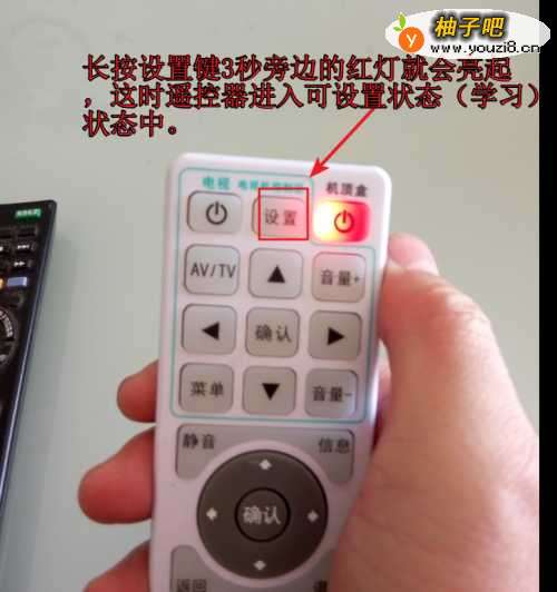5以上条件俱备后就可以进入各键的设置了。进入设置状态,发射端保持3cm( 紧贴也可以);先来设定电源键,先在机顶盒遥控器电视机控制区中按一下电源键,红灯会闪一下(就是说明现在进行该键的设定);紧接着电视机遥控器的“电源”键按下3秒(发射该键的信号编码),机顶盒遥控器的红灯会闪三下后保持长亮(说明接收了信号编码写入并保持设置状态);这时“电源”的功能键就设置完成了。可以等红灯灭后试下设置好的键。其它各键的设置也是一样的,如果在设置过程中没有成功就是其间的步骤出了错,重新设置就行了。