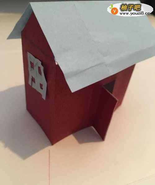 6第六步 最后一步 用蓝色彩纸 做上一个小巧的窗户 再做上屋顶 大约长8.5厘米 宽7厘米 当中折一道 然后在屋脊一周涂上胶水 卡上屋顶 一栋漂亮的小房子就完成了