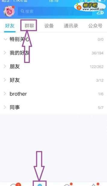 打开聊天软件,进入到联系人页面,在页面上我们可以看到“群聊”。