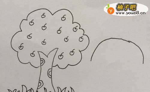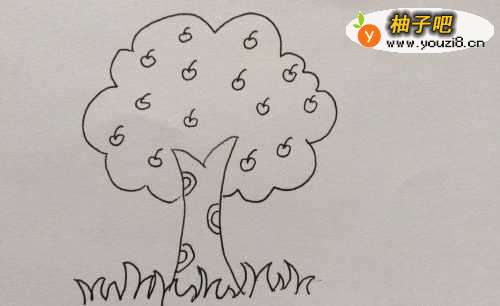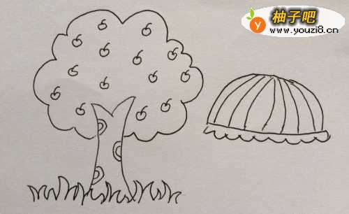 4最后在树下画上一排小草,果树就画好了。