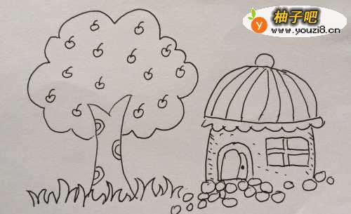 9然后在房子前面画一些小石头,作为屋前的小路。这样果树和小房子就画好了。